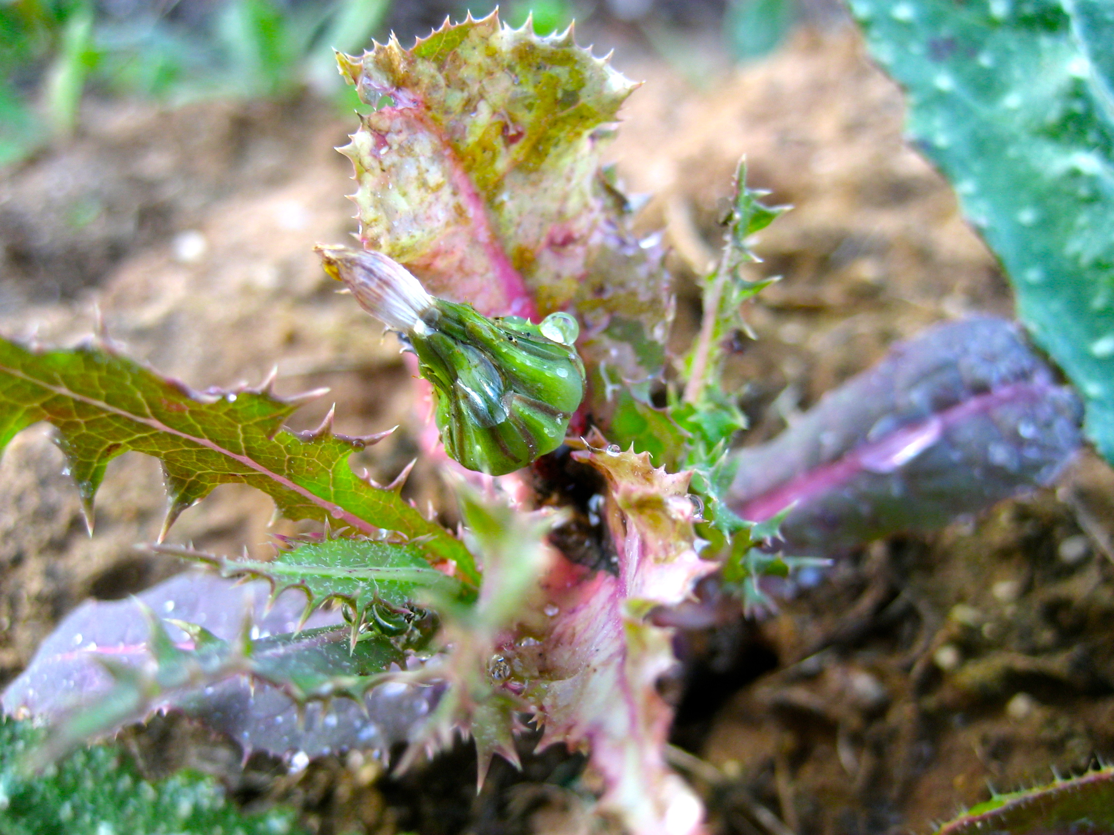 The unlikely beauty of April 6th has endured a growth spurt. The flower is starting to elongate and soon petals will emerge. Perhaps a fairy will be inside? This growing process is all about strength and this weed is showing some scars of the struggle; some old age spots and a bit of browning at the edges. The purpose of a leaf is after all, to fuel the flower. So before, it was the foliage that caught the eye of passerbys. But now, this weed has toned down its colors and prepares to bloom.