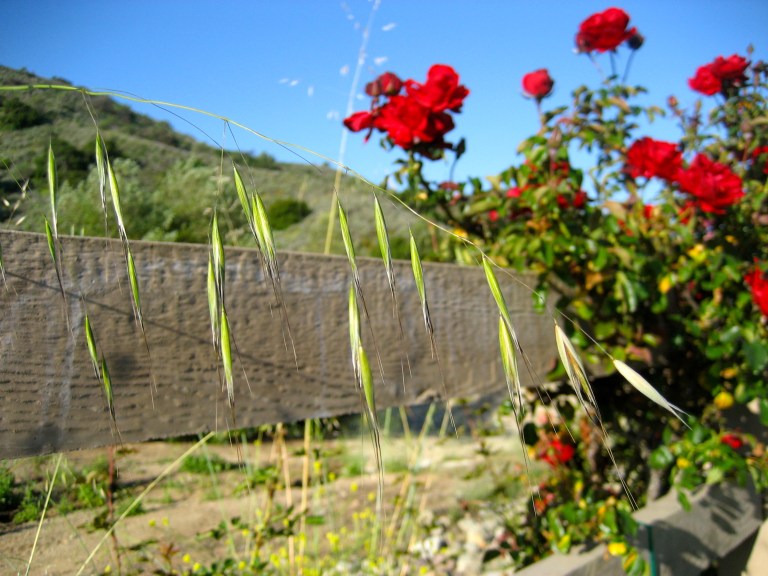 On a sunny day about almost two years ago, I walked that same route alone, and spied a sight like the one pictured here. I saw a raggedy weed that pitted itself against the attention-getting beauty of the vibrant red roses, and that became the inspiration for my focus on weeds.