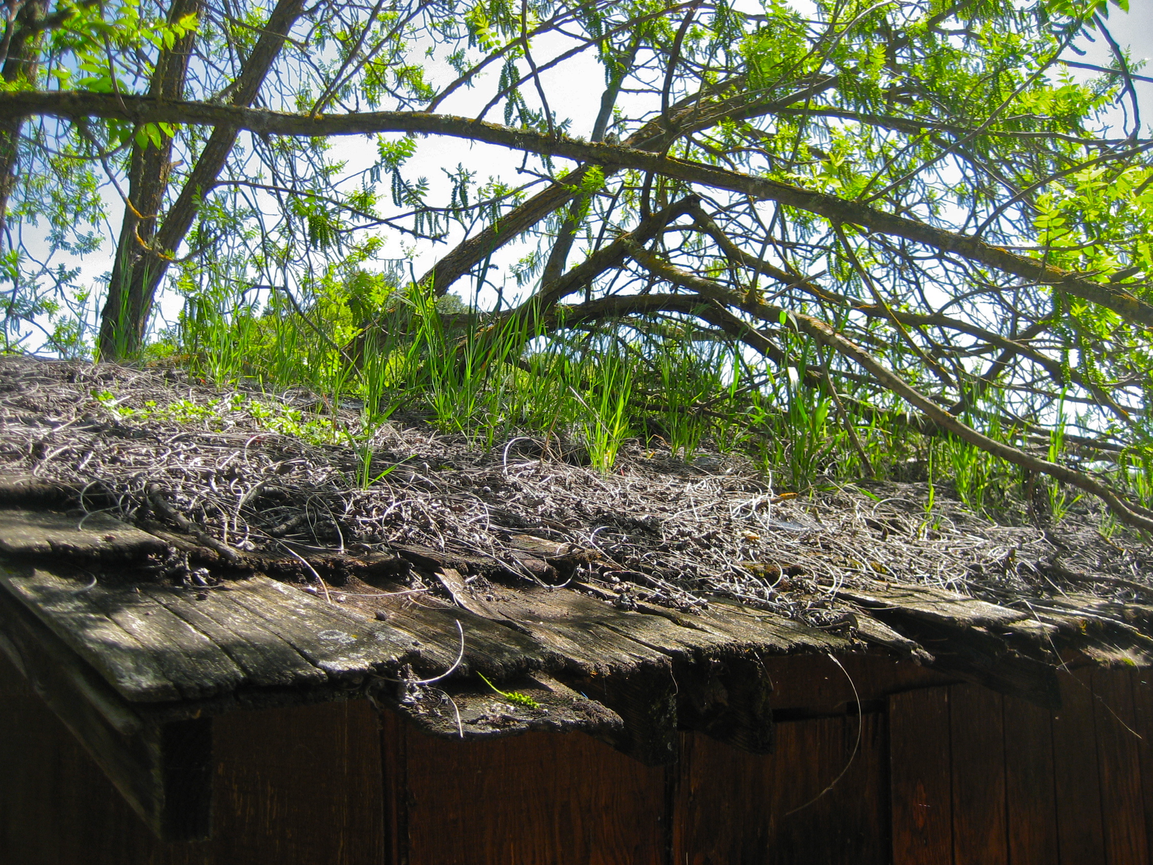 There are weeds overhead. There are weeds Over my HEAD! There are weeds on my roof. There are weeds IN my roof! MY roof is WEEDS! My weeds shelter me, dampen the noise of the thunder, strengthen the fibers of my decaying wooden shingle roof, absorb the rain and divert its piercing forces away from the holes. My weeds shelter life on my roof. My weeds make my roof a living thing. I am living in a living shack because my weeds make it so. Field mice, bugs and the birds that come to eat the bugs all call my roof home. My weed roof sings me to sleep with the night breezes, misplaced grass blades humming with life.