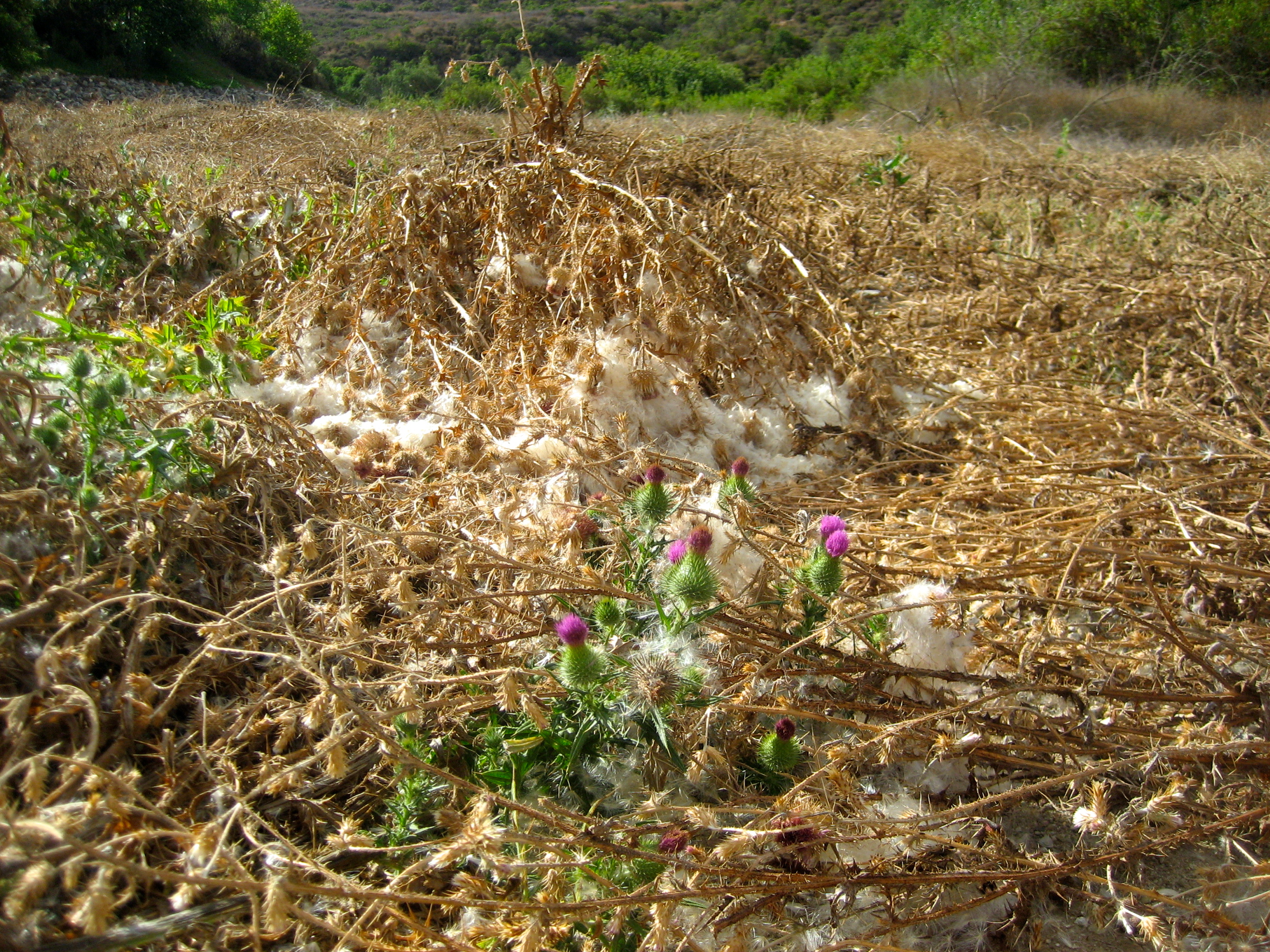 Do you see what their labor has wrought? Why, I see a grand opportunity for fresh seeds to rest, to gather, to self congratulate and coordinate the details of their mission before they launch into the air and conquer the outlying areas. Man’s plans have created a sea of seeds cresting around the humped back whale shaped demolished weed pile. The winds will surely swirl eddies of thistle futures and the currents of air will disperse them quite speedily.