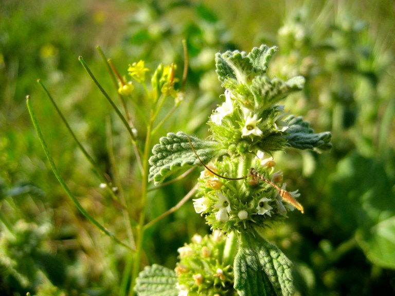 In contrast, the weed of action: the spiraled weed seed torpedo exploded recently from its host plant and burst into the air looking for the best place to land. It had a plan, a dramatic, “change the world” plan and it was to carry it out one seed at a time. On route to world changing, the spiraled explorer found a place to rest in the welcoming soft leaves and sweet blossoms of the horehound, who was very happy to do its part. Thank you weeds, for the fine examples of community.
