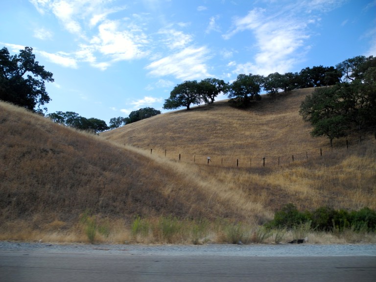The California Oaks dip down to meet their partners from the adjacent hill and are met in kind by another grouping of ancient trees creating a beautiful melody. The barbed wire fence rises and falls marking the time in rhythm like a metronome, while the clouds dance above changing the tempo according to the will of the wind. Golden tinged hills dictate the form of the musical production using their solid structure as the base to which the dancers can cling. This view of oaks and hillside grasses dance with the tumbleweeds and the sky, creating a fluid symphony of blue, gold and green. Life on the roadside is a beautiful dance. I rocket along and my moods sway, undulate and rise and fall according to the natural score just outside my window. How lucky I am to glimpse the ballet in movement, to see the dancing in the hills!