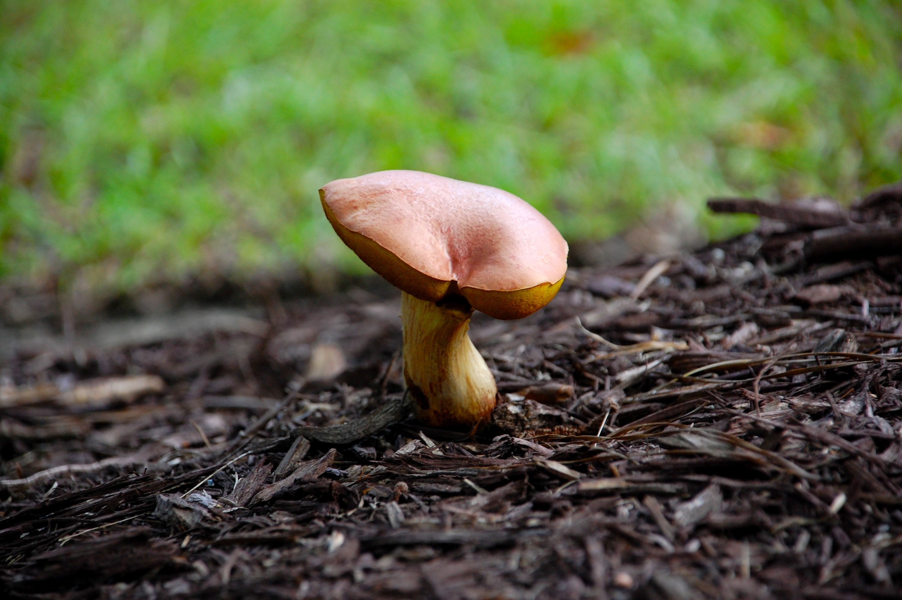 The sudden downpour, complete with thunder and lightning, dramatically soaked the fields. In doing so, the storm woke the fungi underlings out of their humid, languorous doze up so they could sprout up out of the ground and grow to full height overnight. The mushrooms popped up everywhere in quick spurts of growth. They took advantage of the damp conditions and the cooler air, knowing that the scorching sun of morning and the increasing heat of the day to follow would fade them quickly. This darling mushroom is puckering up, reading herself for a kiss from one of her neighbors who has yet to burst out of the ground. She will be ready for love, for she strives to attract a companion quickly, while the night is still young.