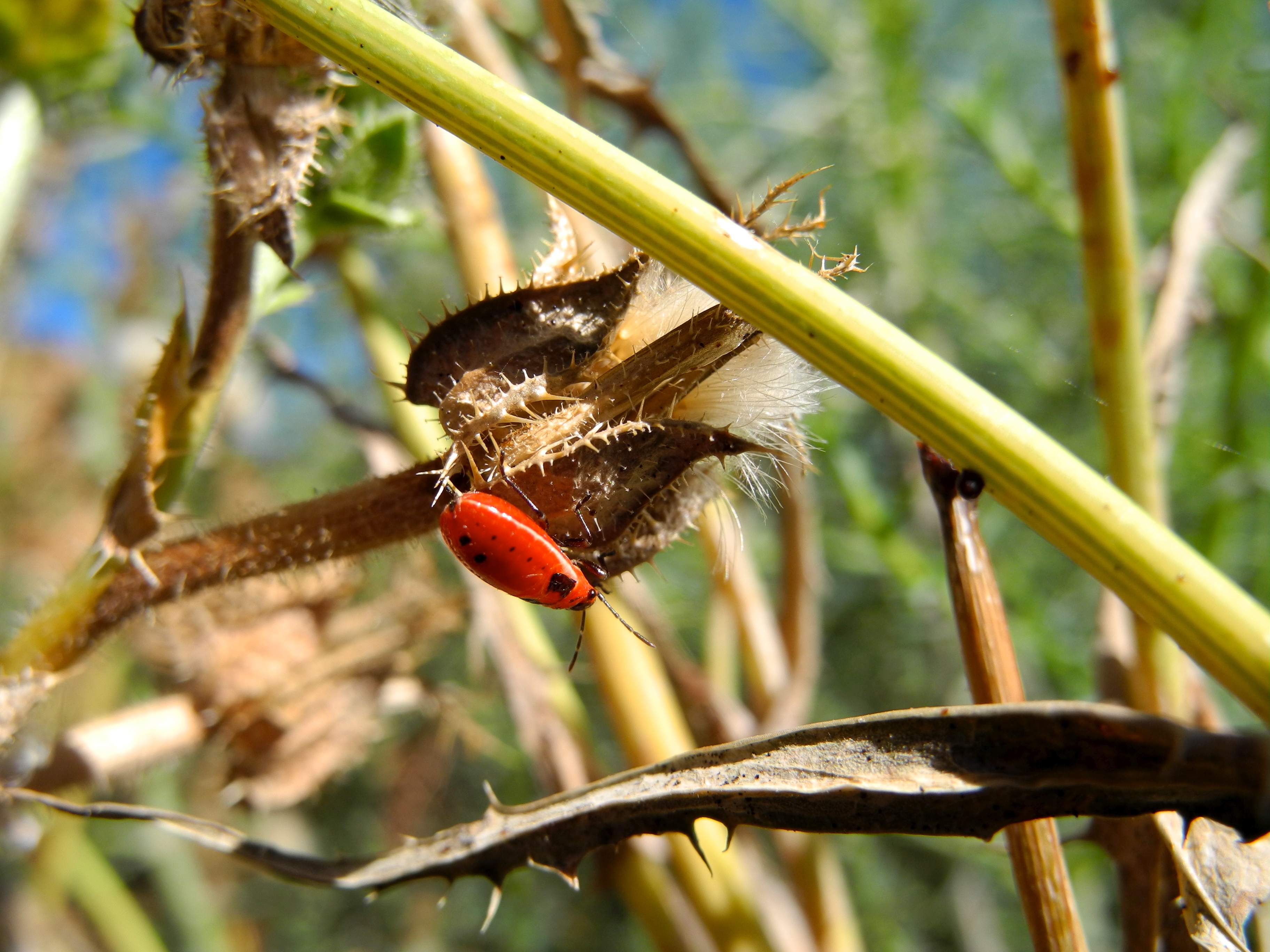 The mysterious wanderer was constantly moving as he traversed the thick growth of the jungle, alert for the signs that would point him to his goal. He preferred to make his way on the ground at first. It was cooler there, and he made quick progress, but sometimes he ran across other beetles, ants or spiders, and he knew better than to mingle, so when his path intersected with another, he made his way up, high into the canopy where the sun was able to penetrate the thick growth. He made slower progress in the heat, but the canopy presented him with an exciting network of intersecting paths from which to choose. He was able to explore a greater variety of growth, and he made new discoveries along the way. He sampled a little bit of a leaf here, another taste from another plant, further along. And best of all, no one bothered him on his circuitous route through the growth, for he preferred to stay anonymous. When he came across the thorn encrusted dried flower husk, he circled up and down and around it, seeking for a way in. Surely there would be a succulent treat inside!