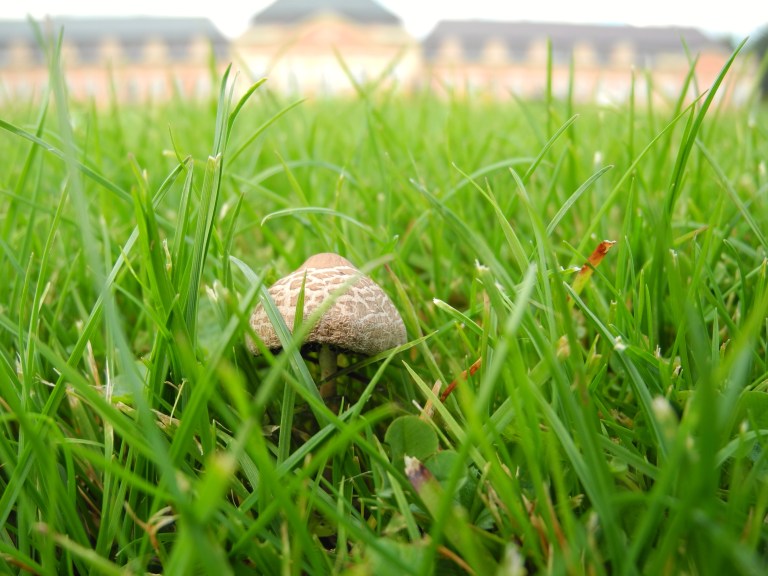 On the grounds of Dobris, a small mushroom felt bold. He popped up his crown in the middle of a sea of expertly cut grass. He could hide fairies under his crown, he could host mini parties for ants, or provide shelter for those who allow themselves to travel on the wings of  thoughts turn to imagined and magical ideas. Mushrooms are self aware when they are underground, and this little peaked one selected the exact spot from which to emerge. He sought to illustrate his appreciation for beauty and form by echoing the peak roofed castle building, and also to contribute to it. With skin patterned like cobblestones and a bell shaped form, the little mushroom spoke the language of the land as he rang out loud and clear, ” I am here! I am the treasure you can find if you look closely at the details!” What a brave little mushroom, to peek up in a a sea of green perfection.