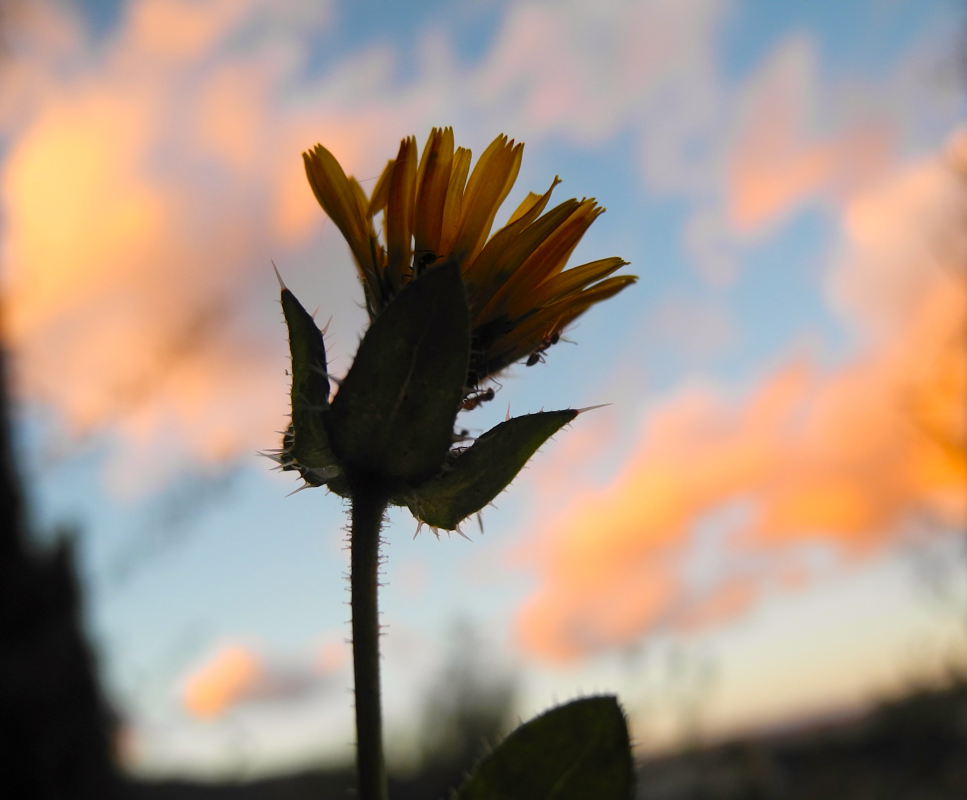Today is Saturday. WOW! What a relief! A day to take a breath, a day to sigh, a day to watch the beautiful sunset. I am lucky today. Today I triumphed in taking my time and looking around at the life around me. And what do you know? I looked up and I noticed that we had a beautiful sunset! The glow of the sky and the clouds paints beautifully over the most scraggly of weeds, but I spied this Picris Echiosdes (Bristly Ox Tongue) blooming valiantly in chorus with the brightly colored sky.