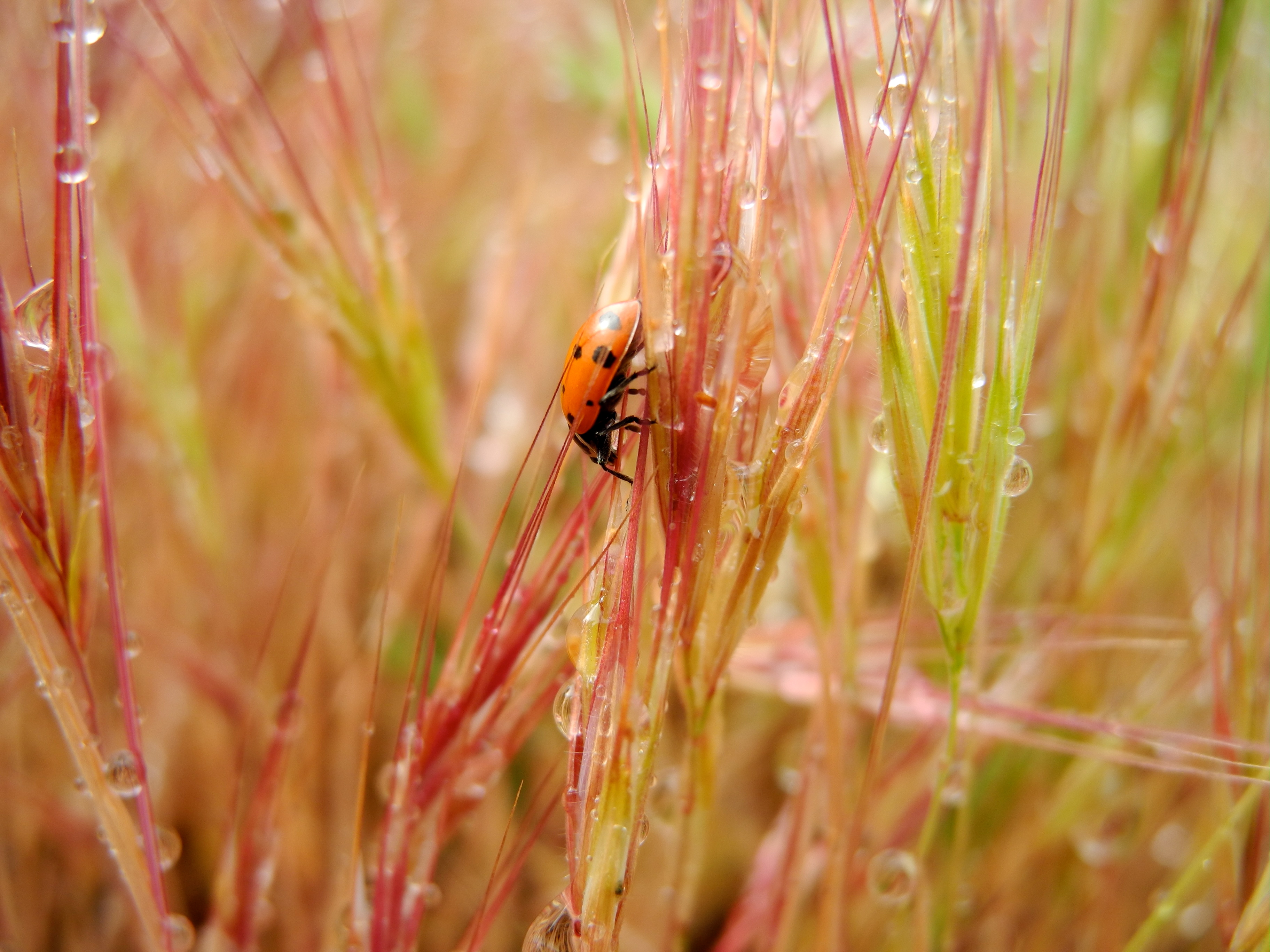 Easter Candy RedThere was no Easter egg hunt today at my house, as my kin have more serious pursuits to pursue. However, I still enjoy a wander outside on a daily basis – no special event needed. So as I searched the wet weeds after today’s rain soaked everything, I was rewarded with an Easter surprise in the grass! I found her, candy colored red, the first ladybird of the season! She was hiding amongst the pink-toned foxtails decorated with spring’s diamond rain drops that glimmered with the light from above.