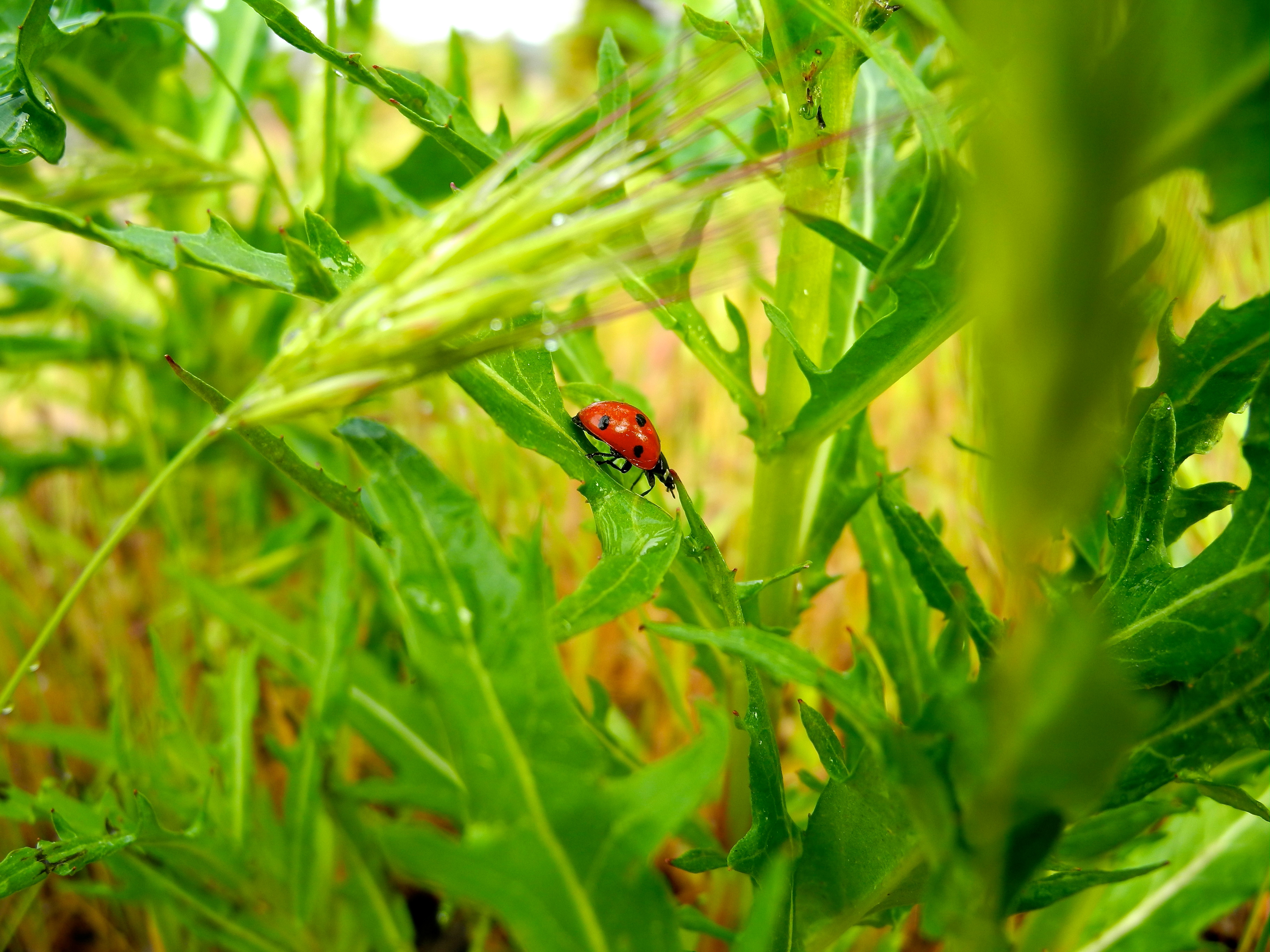 I spied her at last! The ladybird paid me no mind, but it seemed she was aware of me as she granted me just a few seconds to delight in her presence. I enjoyed my stolen private moment and watched the red ladybird beetle as she made her escape. She moved quickly, winding around stems and under leaves and deep, deep into the deeper layers of the magic weed forest.