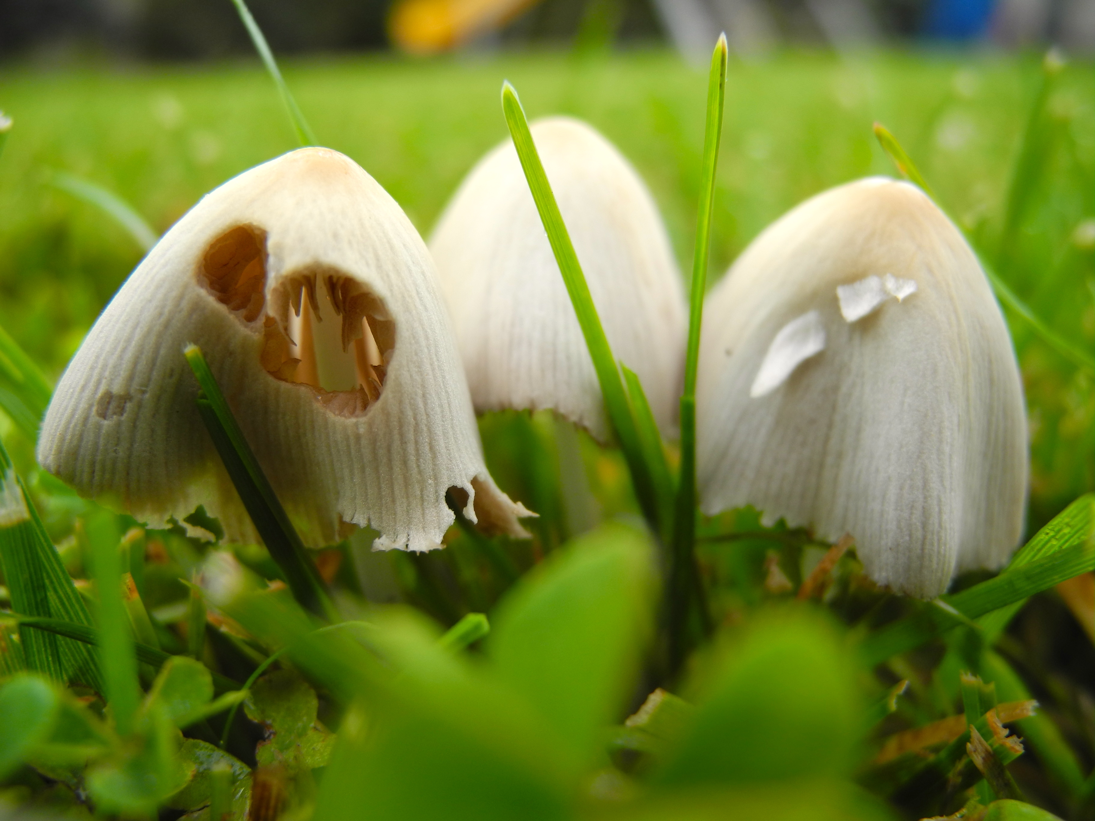 Dear, simple mushrooms. It is not so complicated as all that. Yes, your time here is short. And that is because in a day or so, the grass will be cut and along with it, you. The slimy predator who took advantage of you in the dark was a snail, obviously hungry for a few mouthfuls of your soft skin. You might thank your lucky stars that at least the snail did an artful job, and left you with a face.