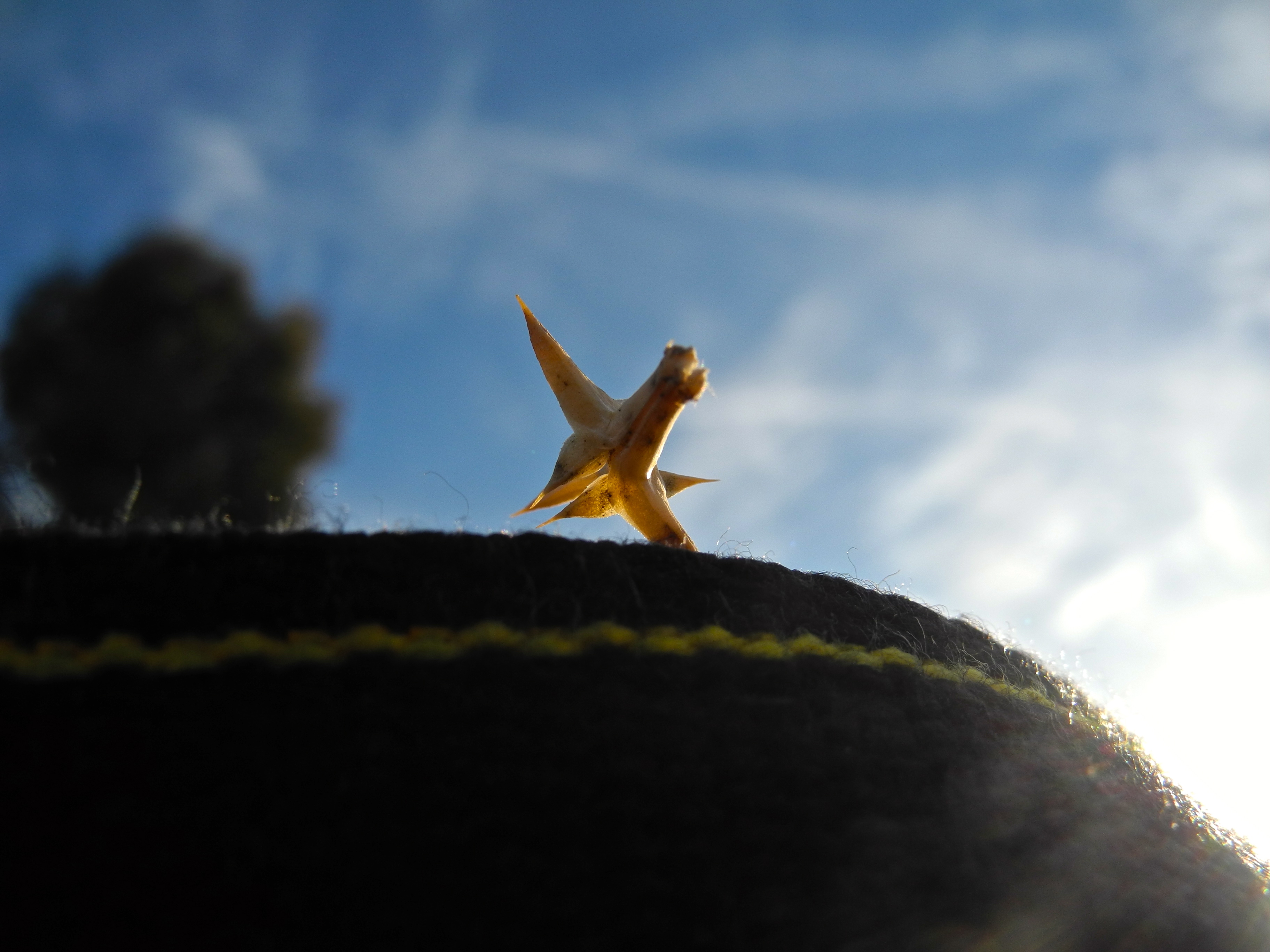 But of course the tumbleweed seed was a stowaway upon the camera strap, and so time was precious. When the images had all been captured and the wind came up too strong to allow the weeds to stand still and pose, the photographer started to head back to her house. She gathered up her camera to secure it over her shoulder and a sharp point brushed against her arm. She looked down to spot the irritation and discovered the seed that had hitched a ride.