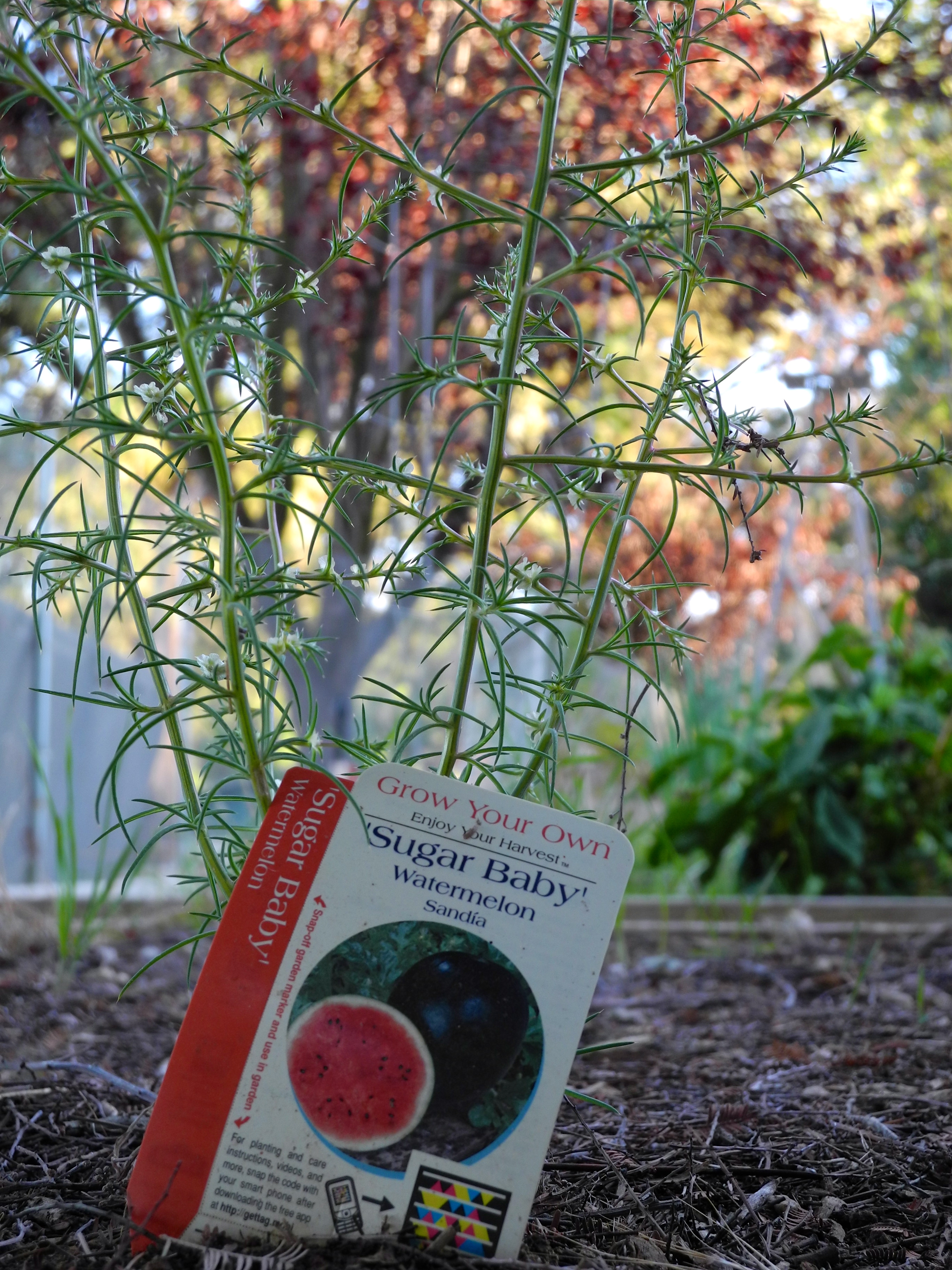 Who’d a thunk that a tumbleweed would sprout in this exact spot – as if to taunt me, the way only gardeners can be taunted. I can see no evidence of any round juicy fruit, except for the manufactured sign, but I can see a very healthy tumbleweed that is getting regular water and plenty of sunshine! Watermelon may not be my forte, but I sure can grow my own Tumbleweed!